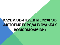 По поручению заместителя Председателя Правительства края по социальным вопросам, Никонова Евгения Леонидовича, для внедрения новых форм взаимодействия с гражданами, расширения видового состава хранящихся в архивах документов по истории Хабаровского края, увеличения приема на хранение документов, являющихся незаменимыми источниками сведений о событиях ушедшего времени, обычаях, нравах, вкусах и привычках предшествующих поколений, был создан клуб любителей мемуаров "История города в судьбах комсомольчан". Комитетом по делам ЗАГС и архивов Правительства Хабаровского края был дан старт новому социально значимому проекту.