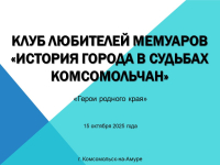 15 октября 2025 года на базе Комсомольского-на-Амуре городского архива состоялось очередное заседание Клуба любителей мемуаров «История города в судьбах комсомольчан». В мероприятии приняли участие представители комитета по делам ЗАГС и архивов Правительства Хабаровского края, администрации города Комсомольска-на-Амуре, архивных учреждений края, учреждений культуры, фонда «Защитники Отечества» ветеранских организаций города и Комсомольского района, преподаватели высших и средних учебных учреждений, студенты и школьники города Комсомольска-на-Амуре.