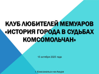 15 октября 2025 года на базе Комсомольского-на-Амуре городского архива состоялось очередное заседание Клуба любителей мемуаров «История города в судьбах комсомольчан». В мероприятии приняли участие представители комитета по делам ЗАГС и архивов Правительства Хабаровского края, администрации города Комсомольска-на-Амуре, архивных учреждений края, учреждений культуры, фонда «Защитники Отечества» ветеранских организаций города и Комсомольского района, преподаватели высших и средних учебных учреждений, студенты и школьники города Комсомольска-на-Амуре.